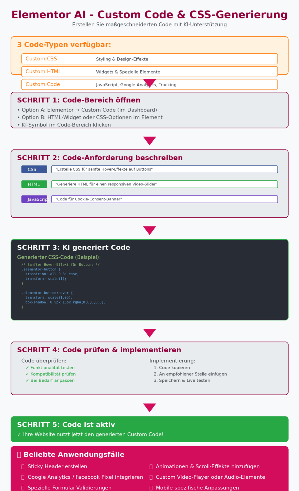 Schritt 6: Kopieren Sie den Code und fügen Sie ihn an der empfohlenen Stelle ein. Bei Custom CSS fügen Sie ihn in die entsprechende CSS-Sektion ein, bei Custom Code nutzen Sie die Custom Code-Funktion von Elementor.