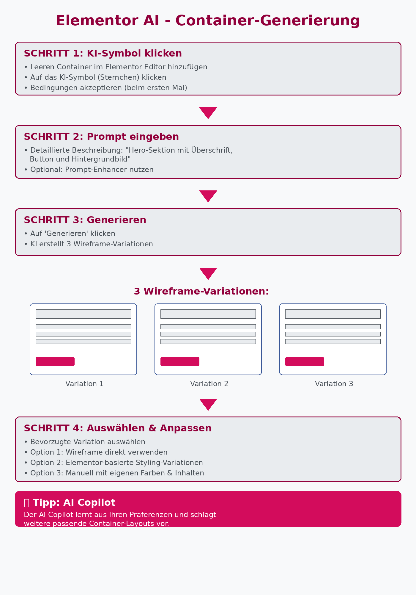 Die Container-Generierung ermöglicht es Ihnen, komplette Website-Layouts basierend auf Textbeschreibungen oder durch Referenzierung existierender Websites zu erstellen. Die KI erzeugt zunächst Wireframes – grundlegende strukturelle Blaupausen –, die Sie anschließend mit Ihren eigenen Designelementen, Farben und Inhalten füllen können.