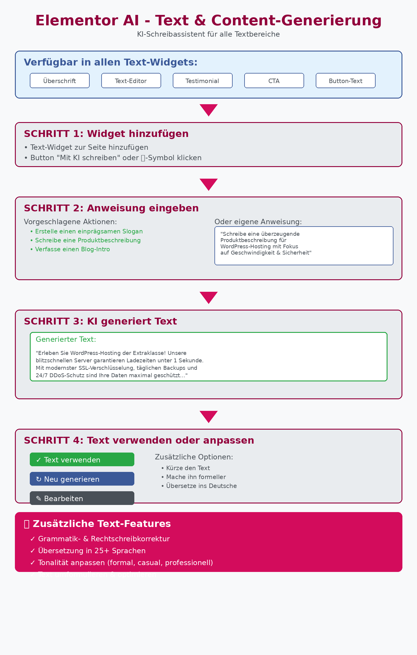 Die KI-Engine wird kontinuierlich aktualisiert und verbessert. Aktuelle Updates konzentrieren sich auf bessere Kontextverarbeitung, präzisere Textlängen je nach Widget-Typ und verbesserte Container-Variationen, um noch beeindruckendere Ergebnisse zu erzielen.