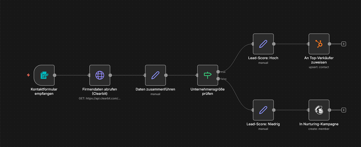 Szenario: Ein Lead füllt Ihr Kontaktformular aus. Automatisch werden Firmendaten (Größe, Branche, Umsatz) aus öffentlichen Datenbanken abgerufen und das CRM-Profil angereichert. Basierend auf definierten Kriterien (z.B. Unternehmensgröße >50 MA) wird der Lead mit einer Punktzahl (Score) versehen und bei hoher Priorität direkt an Ihren Top-Verkäufer weitergeleitet. Niedrig priorisierte Leads landen in einer Nurturing-Kampagne.