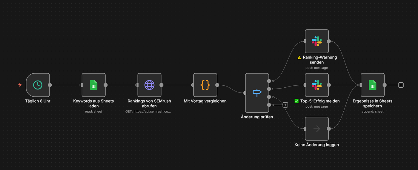 Typische Tools: n8n, Ahrefs/SEMrush API, Slack/E-Mail
