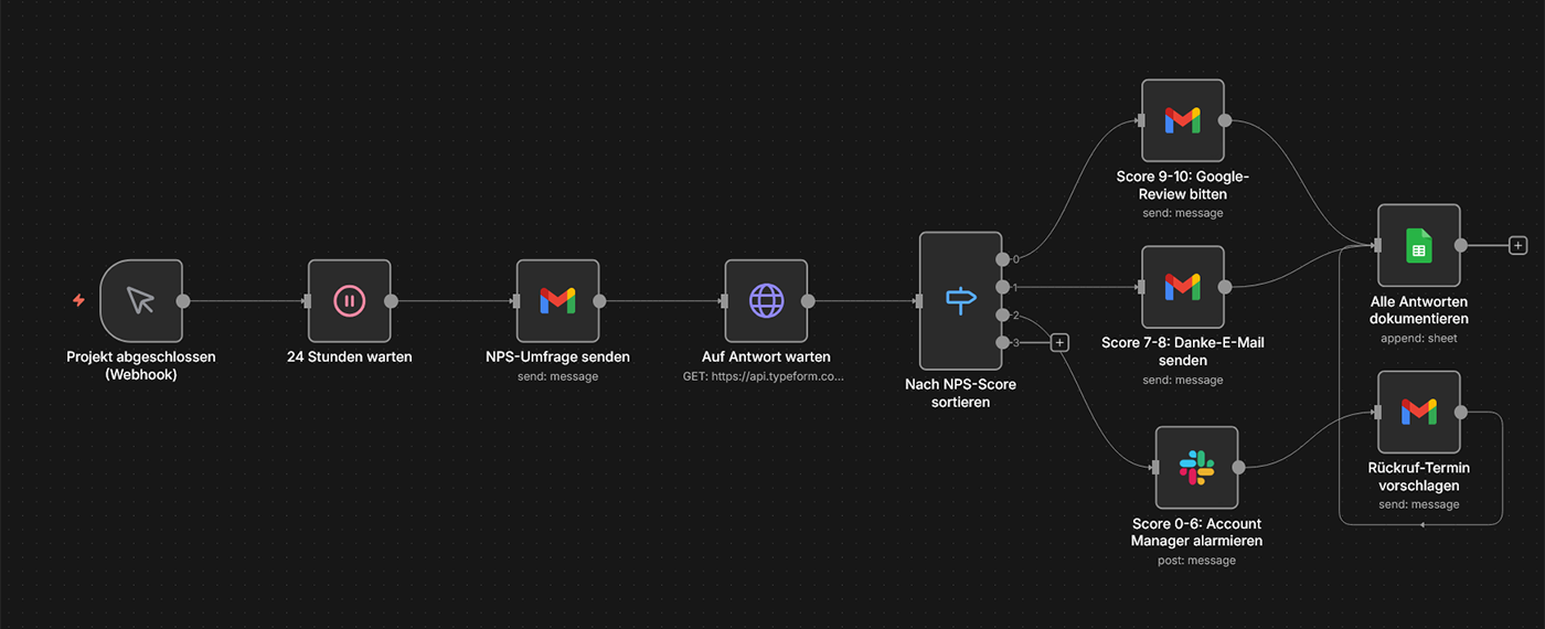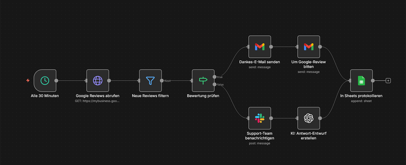 Typische Tools: n8n, Google My Business API, Trustpilot API, Gmail