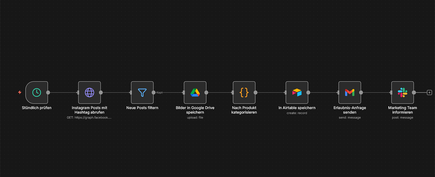Szenario: Kunden posten Fotos Ihrer Produkte auf Instagram mit Ihrem Hashtag. Der Workflow sammelt automatisch alle Posts, speichert die Bilder in einem Google Drive-Ordner, kategorisiert sie nach Produkt und holt (nach Einverständnis) die Erlaubnis zur Verwendung ein. Ihr Marketing-Team hat ständig frisches UGC-Material, ohne manuell Instagram zu durchforsten.