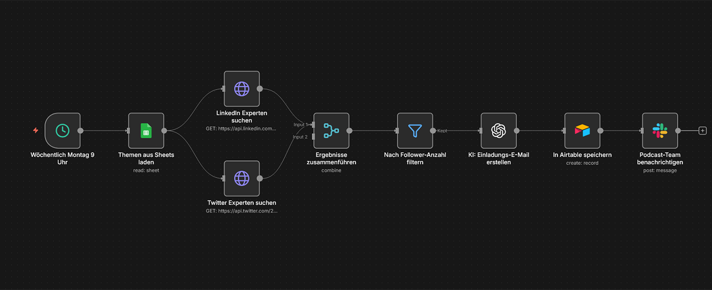 Szenario: Sie betreiben einen Podcast und suchen regelmäßig nach passenden Gästen. Der Workflow durchsucht LinkedIn, Twitter und Branchendatenbanken nach Experten in definierten Themengebieten, filtert nach Kriterien (z.B. >5000 LinkedIn-Follower), erstellt eine Liste mit Kontaktdaten und bereitet personalisierte Einladungs-E-Mails vor. Aus 20 Stunden Recherche werden 2 Stunden finaler Check.