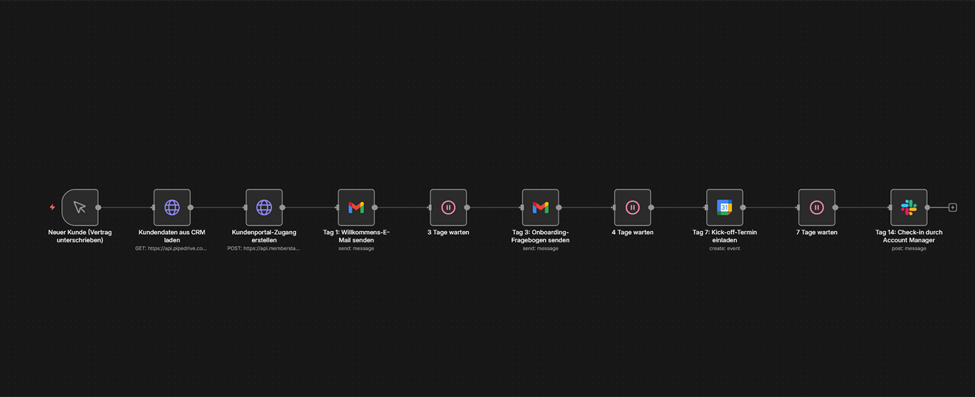 Szenario: Ein neuer Kunde unterschreibt den Vertrag. Automatisch startet eine Willkommens-Sequenz: Tag 1 = Willkommens-E-Mail mit Zugang zum Kundenportal, Tag 3 = Onboarding-Fragebogen, Tag 7 = Termineinladung für Kick-off-Call, Tag 14 = Check-in durch Account Manager. Ihr Team muss nichts manuell anstoßen, kein Kunde fällt durchs Raster.