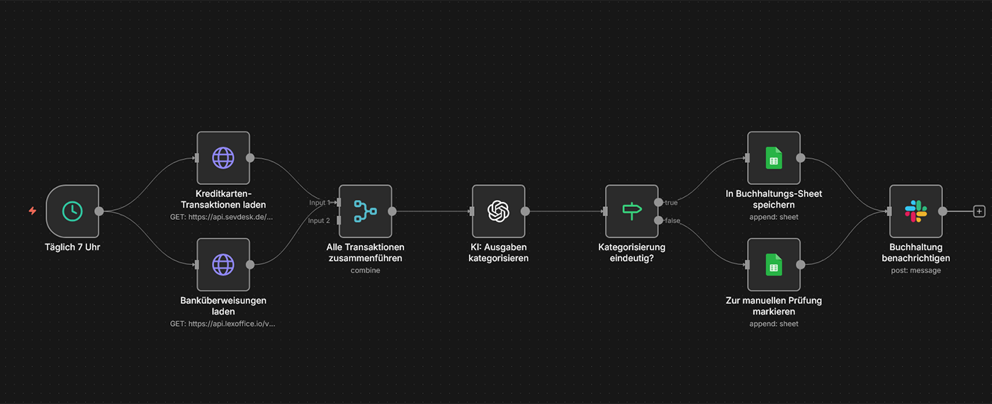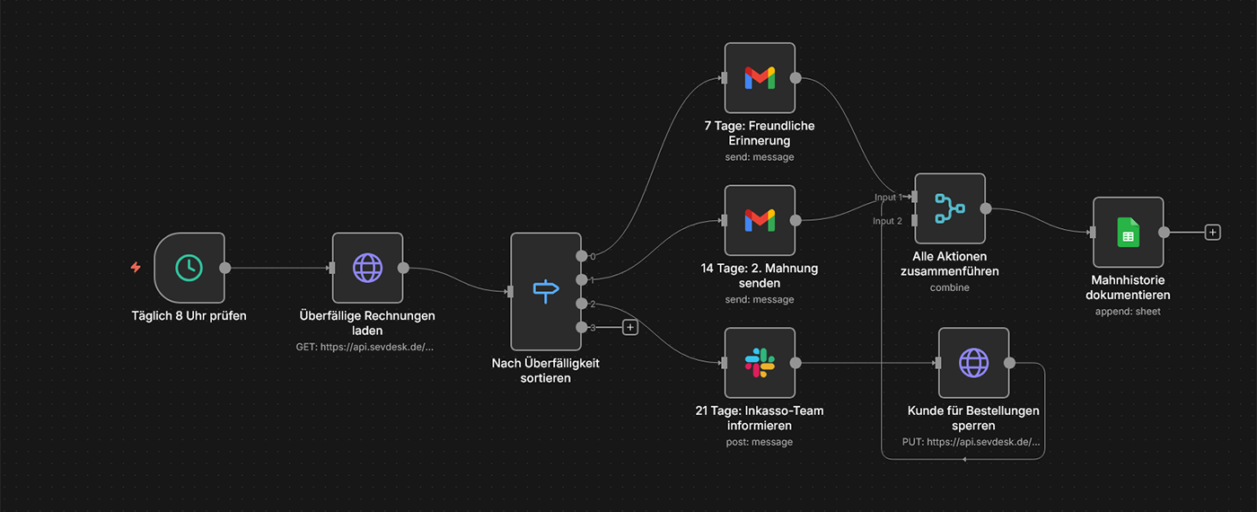 Typische Tools: n8n, sevDesk/lexoffice, Gmail