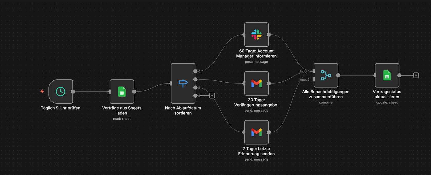 Szenario: Sie haben über 50 Jahresverträge mit Kunden. 60 Tage vor Ablauf wird automatisch Ihr Account Manager informiert, 30 Tage vorher erhält der Kunde eine Erinnerung mit Verlängerungsangebot. Bei Nicht-Reaktion wird 7 Tage vor Ablauf eine letzte Erinnerung versendet. Kein Vertrag läuft stillschweigend aus, keine Umsätze gehen verloren.