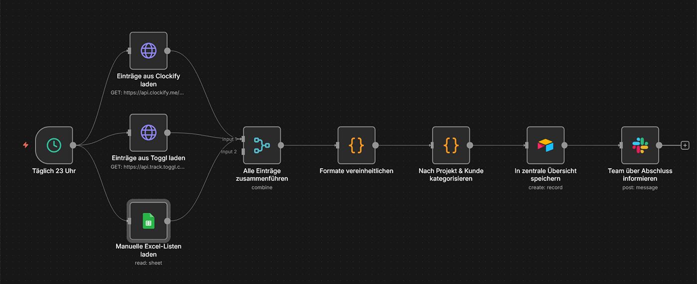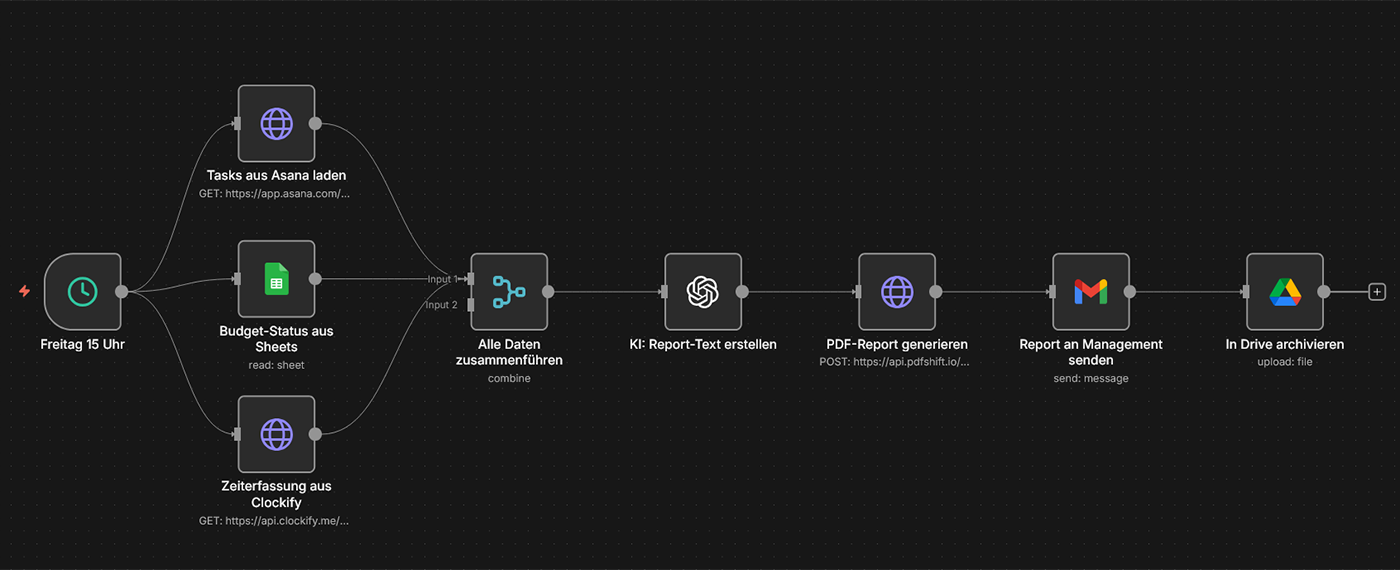 Szenario: Jeden Freitag wird automatisch ein Projekt-Status-Report erstellt: Tasks aus Asana/Trello werden ausgelesen, Zeiterfassung aus Clockify abgerufen, Budget-Status aus Excel/Google Sheets gezogen und in einem übersichtlichen PDF zusammengefasst. Das Management erhält den Report automatisch per E-Mail, ohne dass Projektmanager Stunden mit manueller Berichtserstellung verbringen.