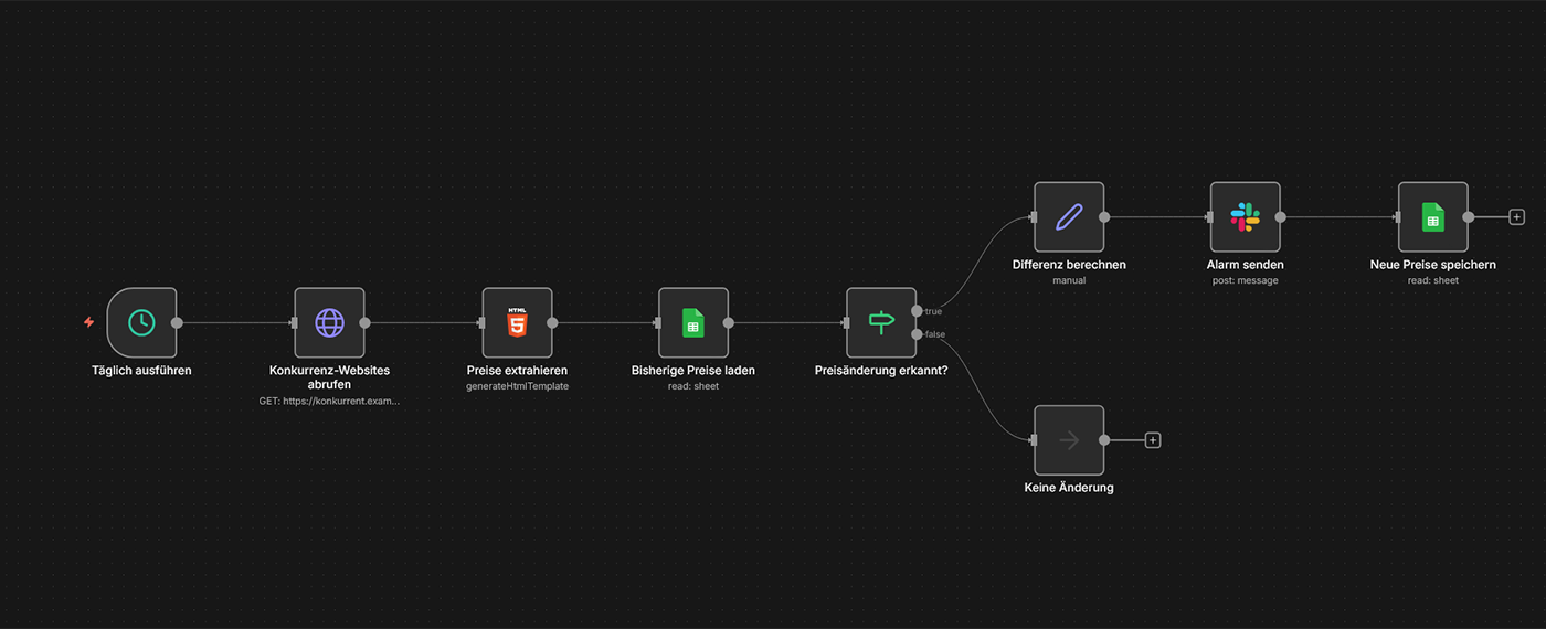 Szenario: Sie verkaufen Produkte in einem preissensiblen Markt. Ein Workflow prüft täglich die Preise Ihrer Top-3-Konkurrenten für Ihre wichtigsten Produkte. Sobald ein Mitbewerber seinen Preis senkt oder erhöht, erhalten Sie eine Slack/E-Mail-Benachrichtigung mit dem Differenzbetrag. So können Sie schnell reagieren, ohne täglich manuell Websites zu checken.
