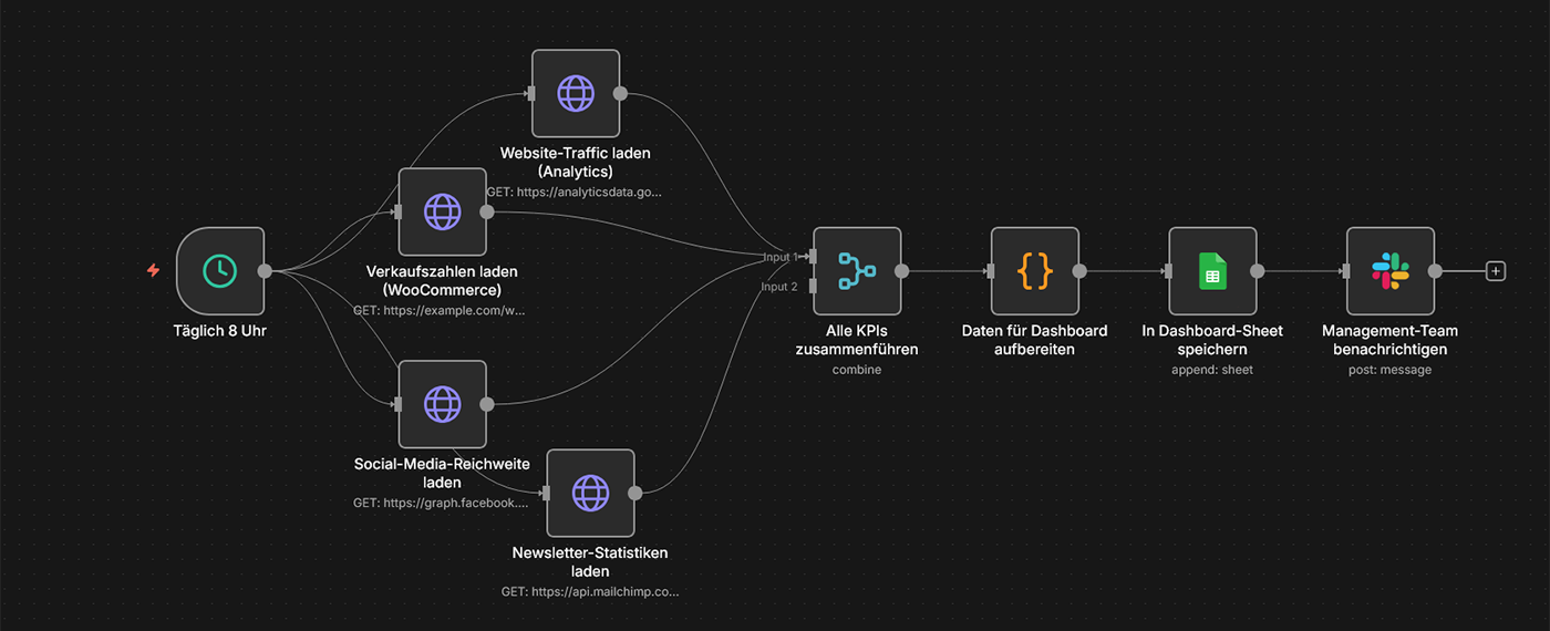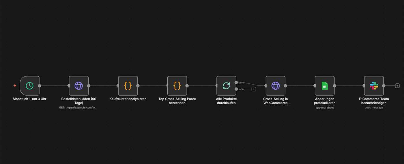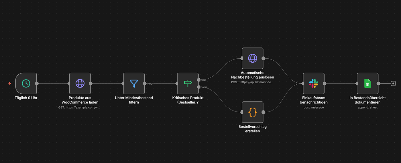 Typische Tools: n8n, WooCommerce REST API, Google Sheets/BigQuery