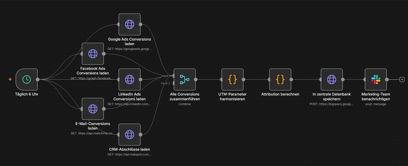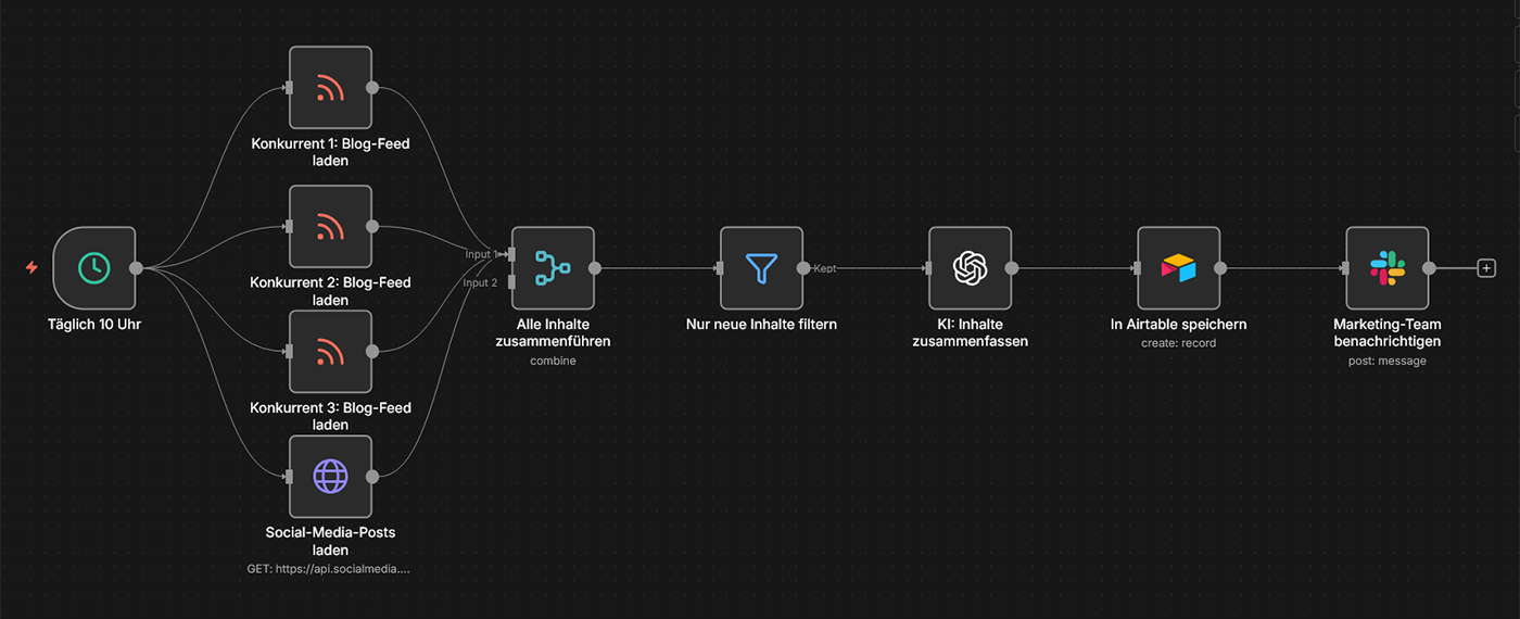 Typische Tools: n8n, Web Scraping, Google Sheets, Slack