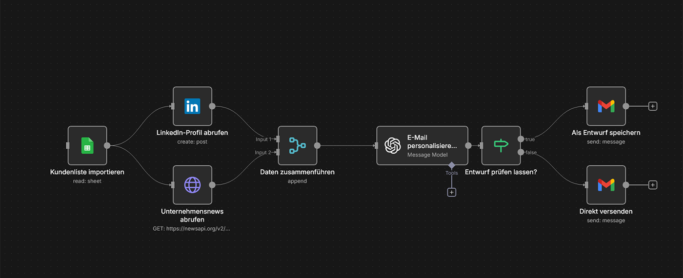 Typische Tools: n8n, GPT-4 API, LinkedIn, Gmail