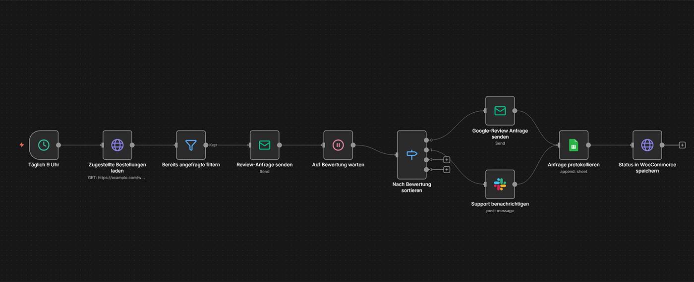 Typische Tools: n8n, WooCommerce, Gmail, Google My Business API