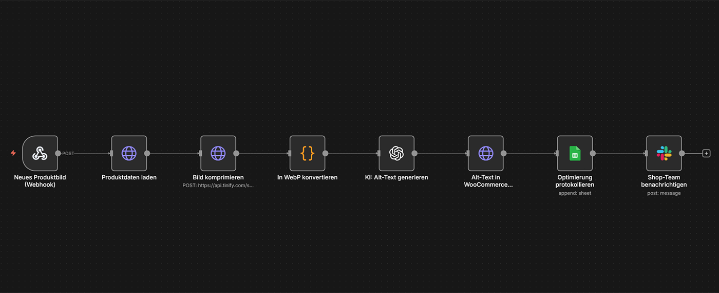 Typische Tools: n8n, WooCommerce, TinyPNG API/ImageOptim, GPT-4 API
