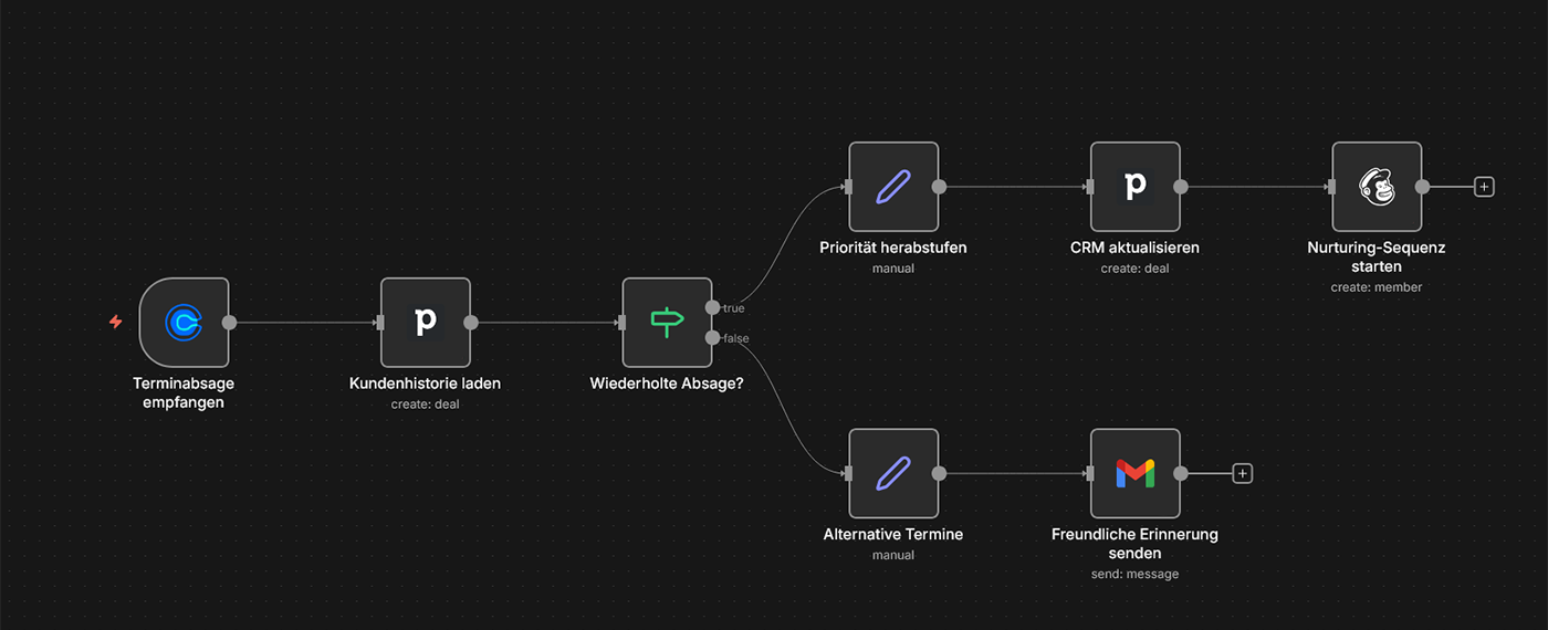 Szenario: Ein potenzieller Kunde sagt einen vereinbarten Call ab oder erscheint nicht. Statt dass Ihr Verkäufer manuell nachfassen muss, verschickt das System automatisch eine freundliche Nachricht mit alternativen Terminvorschlägen. Bei wiederholtem No-Show wird die Priorität des Leads herabgestuft und eine andere Follow-up-Sequenz gestartet.