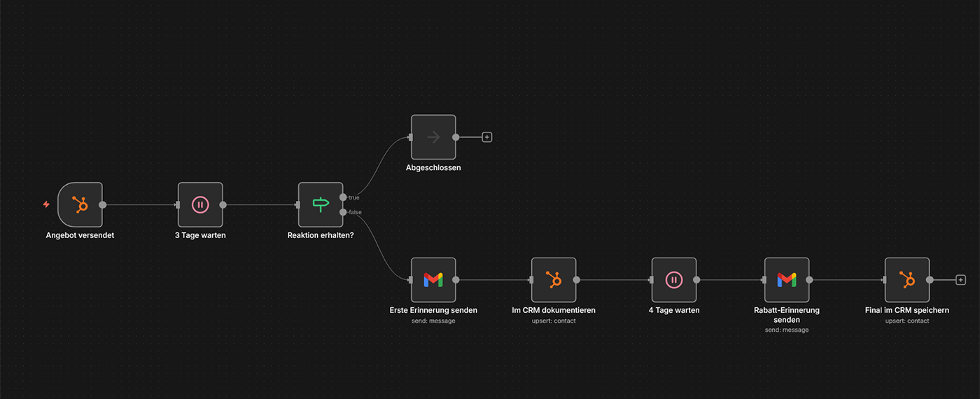 Szenario: Sie versenden ein Angebot per E-Mail. Nach 3 Tagen ohne Reaktion erhält der Kunde automatisch eine freundliche Erinnerung. Nach 7 Tagen eine weitere mit einer zusätzlichen Incentive (z.B. „Bei Beauftragung diese Woche: 5% Rabatt“). Ihr CRM dokumentiert jeden Schritt automatisch, ohne dass Ihr Team manuell nachfassen muss.