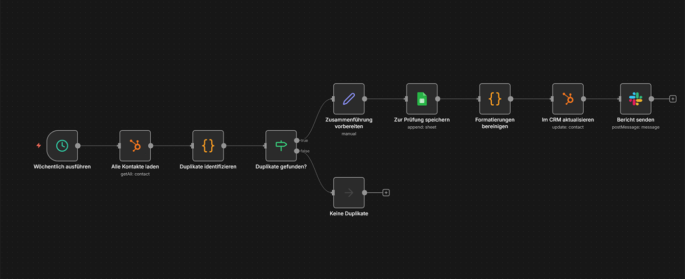 Szenario: In Ihrem CRM sammeln sich über Monate doppelte Kontakte, veraltete E-Mail-Adressen und inkonsistente Schreibweisen („GmbH“ vs „Gesellschaft mit beschränkter Haftung“). Ein wöchentlicher Workflow identifiziert Duplikate anhand von E-Mail, Telefonnummer oder Firmennamen, schlägt Zusammenführungen vor und bereinigt Formatierungen automatisch. Ihre Datenqualität bleibt hoch, ohne manuelle Pflege.