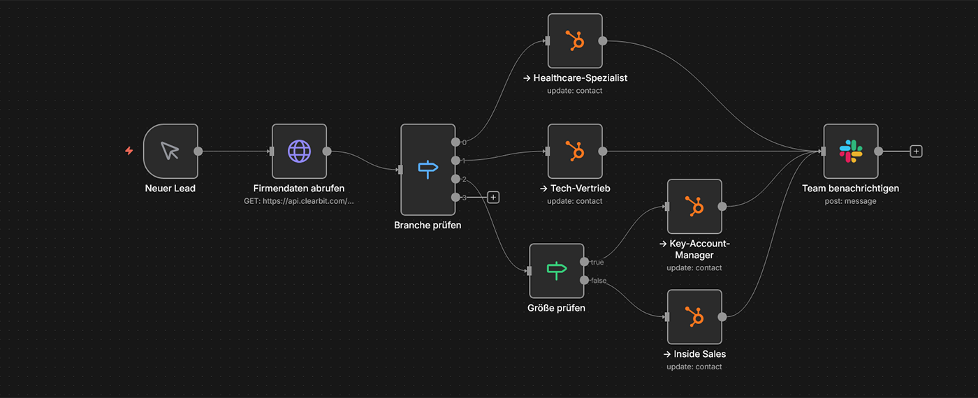 Szenario: Neue Leads werden automatisch dem passenden Vertriebsmitarbeiter zugewiesen: Leads aus dem Gesundheitswesen an Ihren Healthcare-Spezialisten, Großkunden (>250 MA) an Ihren Key-Account-Manager, kleine Unternehmen an Inside Sales. Die Zuordnung erfolgt in Sekunden, basierend auf Firmendaten aus LinkedIn oder Unternehmensregistern.