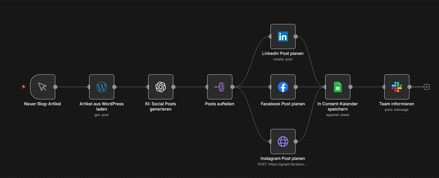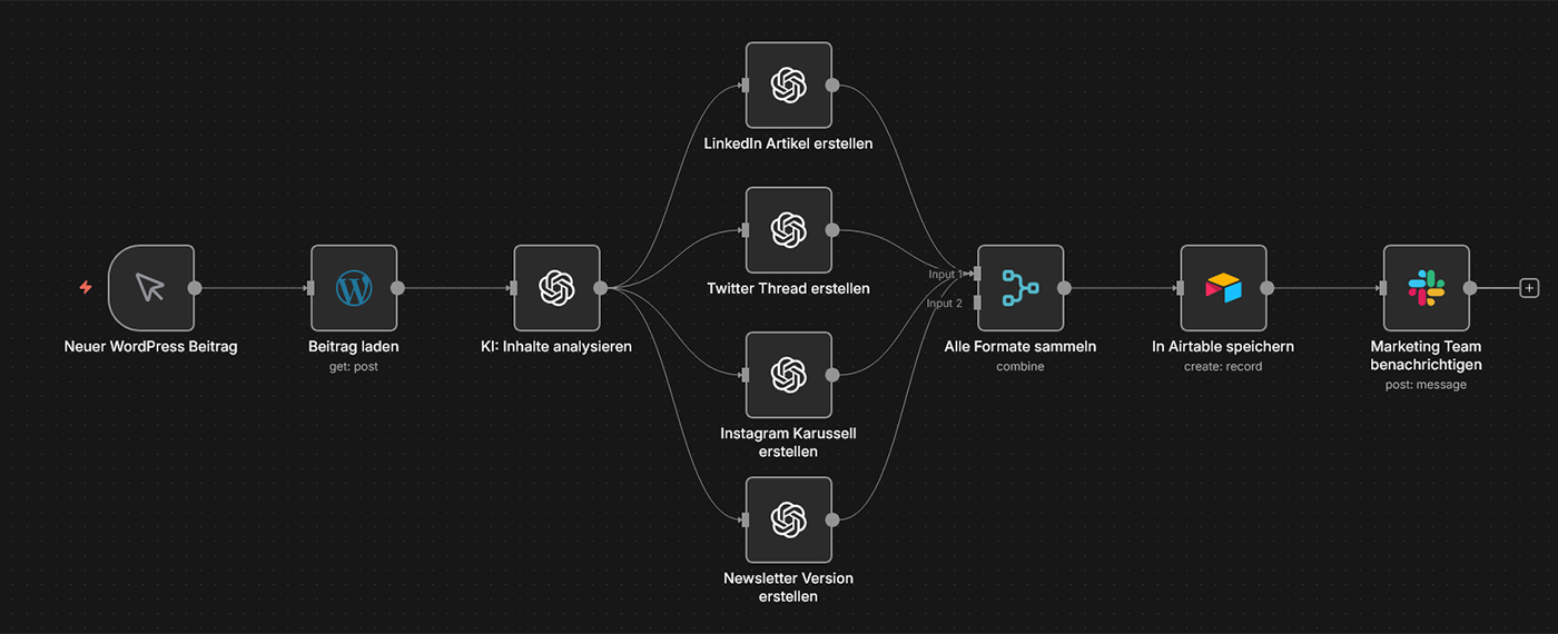 Szenario: Jeder neue WordPress-Blogbeitrag wird automatisch in mehrere Formate umgewandelt: Ein LinkedIn-Artikel mit einer Zusammenfassung für Entscheidungsträger, 3-5 Twitter-Threads mit Kernaussagen, ein Instagram-Karussell und eine E-Mail-Newsletter-Version. Sie schreiben einmal, Ihr Content wird siebenfach verwendet.